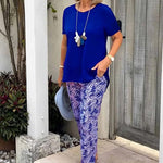 Harmonie de Culori Vibrante: Topul albastru profund și pantalonii cu imprimeu inspirat din tropice creează un aspect modern și striking.