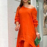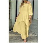 Intra în sofisticare serenă cu Amanda - Set de Eleganță Ușoară, conceput pentru femeile care îmbrățișează stilul cu ușurință. Topul asimetric fluid, combinat cu pantaloni largi și relaxați, creează o siluetă chic fără efort—perfectă pentru escapade însorite, petreceri în grădină sau confortul zilnic elevat.
