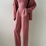Setul Grace din Trei Piese îmbină fără efort sofisticarea clasică cu stilul contemporan. Dotat cu un sacou cu două rânduri de nasturi perfect croit, asociat cu pantaloni coordonați și un top asortat, acest set oferă un ansamblu elegant și armonios care atrage atenția. Ideal pentru întâlniri de afaceri, evenimente formale sau streetwear elegant, este o piesă versatilă care îți îmbunătățește garderoba.