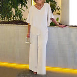 ✔ Silhouette Flattering: Pantaloni largi și un top fluid creează un look chic fără efort.