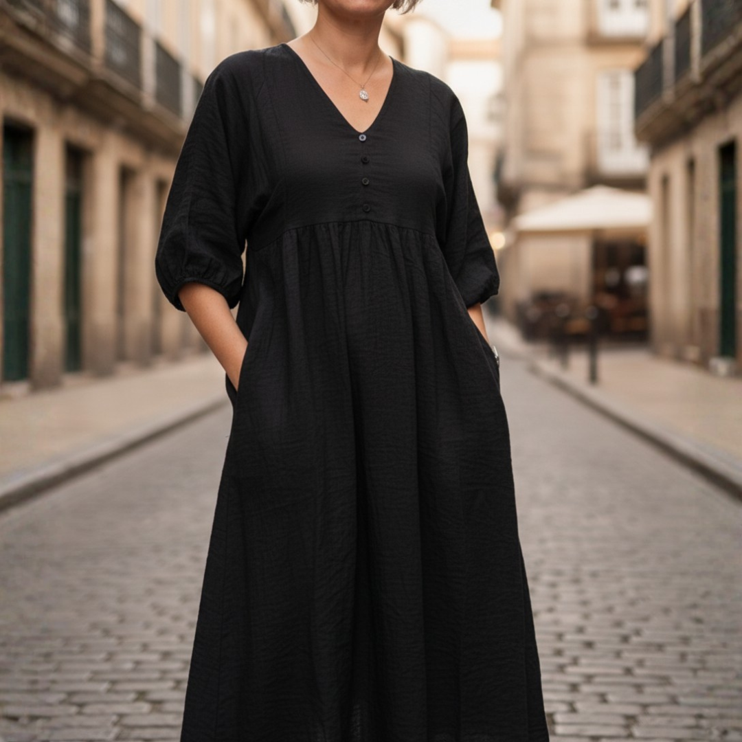 Această maxi rochie pentru femei prezintă un decolteu în V și o talie empire plisată pentru un croi relaxat. Articolul include mâneci scurte puff și buzunare laterale funcționale. Este proiectat cu un tiv la gleznă și o finisare uni pentru utilizare zilnică sau evenimente casual. Acest articol de îmbrăcăminte urmează mărimile standard pentru adulți. Culori disponibile: negru și alb.