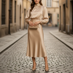 Rochia midi pentru femei este un articol conceput pentru o femeie adultă și potrivit pentru contexte formale, profesionale și de zi cu zi. Modelul este realizat dintr-un material satinat cu o suprafață netedă, gândit pentru a oferi o potrivire regulată și o linie fluidă.